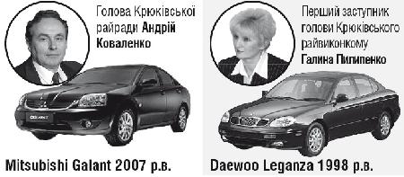 Заступникам голови Крюківського району дістались поважні авто: кожне з них уже 13 роки «на дорогах». У першого заступника Галини Пилипенко – “Daewoo Leganza”, у заступника райради Олександра Калашника – “Kia Clarus”.