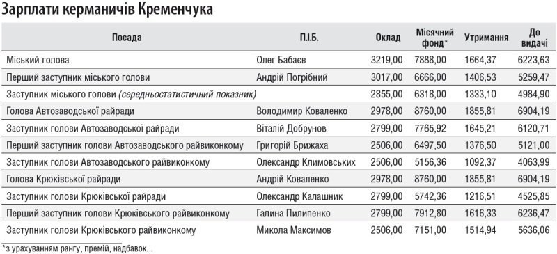 «Телеграф» запитав керманичів Полтавщини та Кременчука про їхні гроші. Нас цікавило, які доходи отримали вони в 2010 році, і на які зарплати зараз проживають. Виявилося, що мер Кременчука Олег Бабаєв отримав минулого року найбільше доходів порівняно з керівниками області. Проте зараз його зарплата менша, ніж зарплата керівника Автозаводського чи Крюківського районів. А заступники міського голови отримують менше, ніж деякі заступники керівників районів.