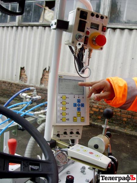 Разметочная машина снабжена программным управлением: можно задать нужный тип разметки (то ли сплошную линию, то ли контур). Можно наносить разметку и на пешеходные переходы. На дисплее высвечивается и расход краски, и оптимальная скорость для разметки, рассказал прораб ДРСУ Станислав Шевченко.