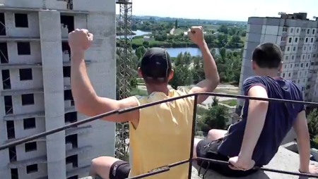 «г.Кременчуг п.Молодежный» и «Как правельно тусить на крыше», – именно так, языком оригинала, называются видео, размещенные кременчужанами на YouTube. На них видно, как молодые люди отдыхают на крыше с пивом и опасными забавами: сидят на крыше 9-этажного дома, свесив ноги. Один из любителей острых ощущений подходит к краю крыши, выбравшись за ограждение, и танцует там.
