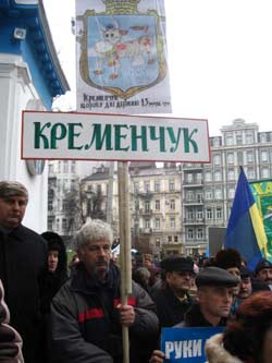 Близько 40 кременчужан на чолі з міським головою Миколою Глуховим минулого четверга о п’ятій ранку виїхали до столиці України, щоб приєднатися до акції протесту Асоціації міст України на Майдані Незалежності. В дорозі виявилося, що мерів випередила партійна діячка пані Вітренко, зайнявши головну площу країни. Отож дислокуватися довелося на „п’ятачку” біля входу на стадіон „Динамо”. За даними виконавчого директора Асоціації Мирослава Піцика, на цю політичну акцію своїх представників прислала 241 територіальна громада із 500 міст. Мера Києва Олександра Омельченка, який очолює Асоціацію, не було.