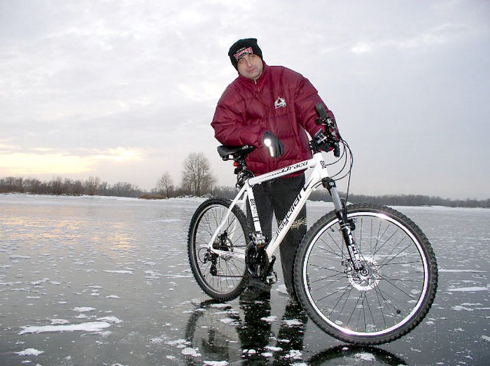 С наступлением сильных морозов, впервые за последние годы Днепр полностью покрылся льдом. Этим воспользовались экстремалы, которые выезжают на лед кататься... и не на коньках, а на велосипедах.
