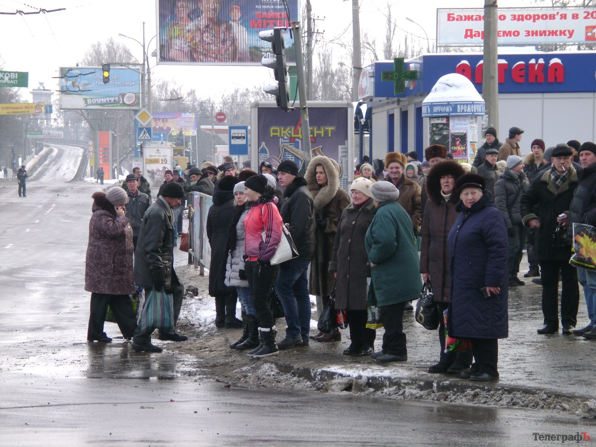 Люди ждут транспорта, чтобы попасть на работу на вторую смену