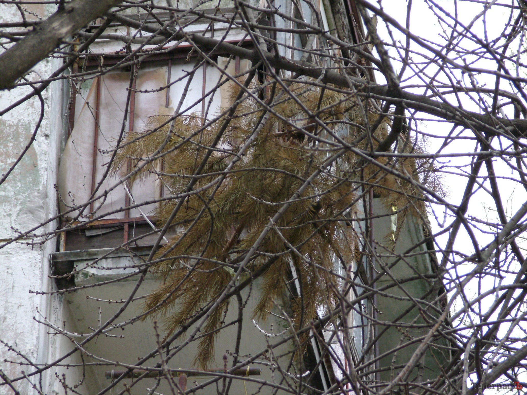 Многие скажут, что это просто кого-то достала жена («вынеси ёлку-вынеси ёлку») – вот мужик и выбросил её, ёлку. Но нет! На деревце виднеются ещё конфеты! Кто бы выбросил её с таким ценным балластом? Значит ёлка са-мо-выб-ро-си-лась.