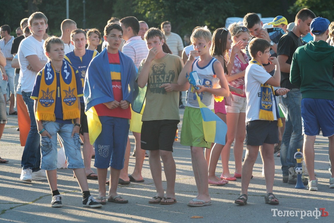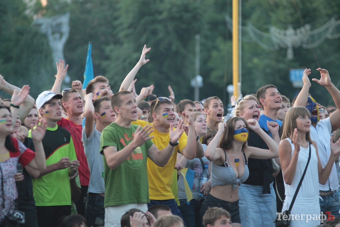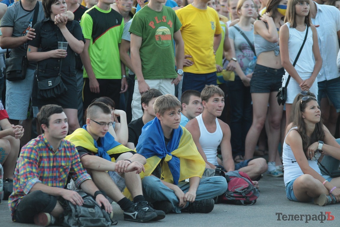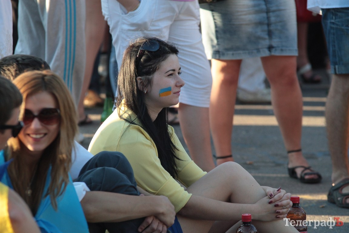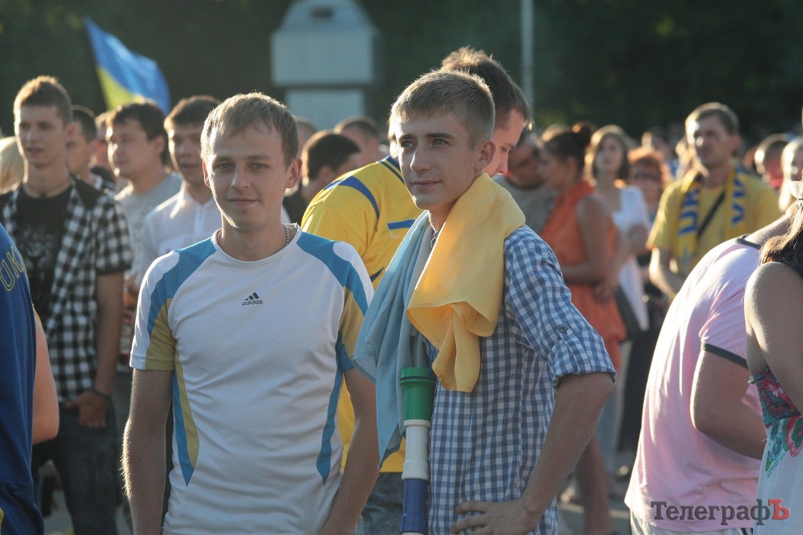 Толпы фанатов с раскрашенными лицами и в футболках «Евро 2012» два с половиной часа кричали, пели, танцевали и прыгали на площади Независимости. Совершенно незнакомые люди разрисовывали друг друга синей с желтой краской и обнимались. Через пять минут после начала матча игру остановили, но фанаты остались на своих местах в надежде на то, что матч все-таки продолжат. Какой же порыв эмоций вызвали слова «матч переносится на 20.00»!