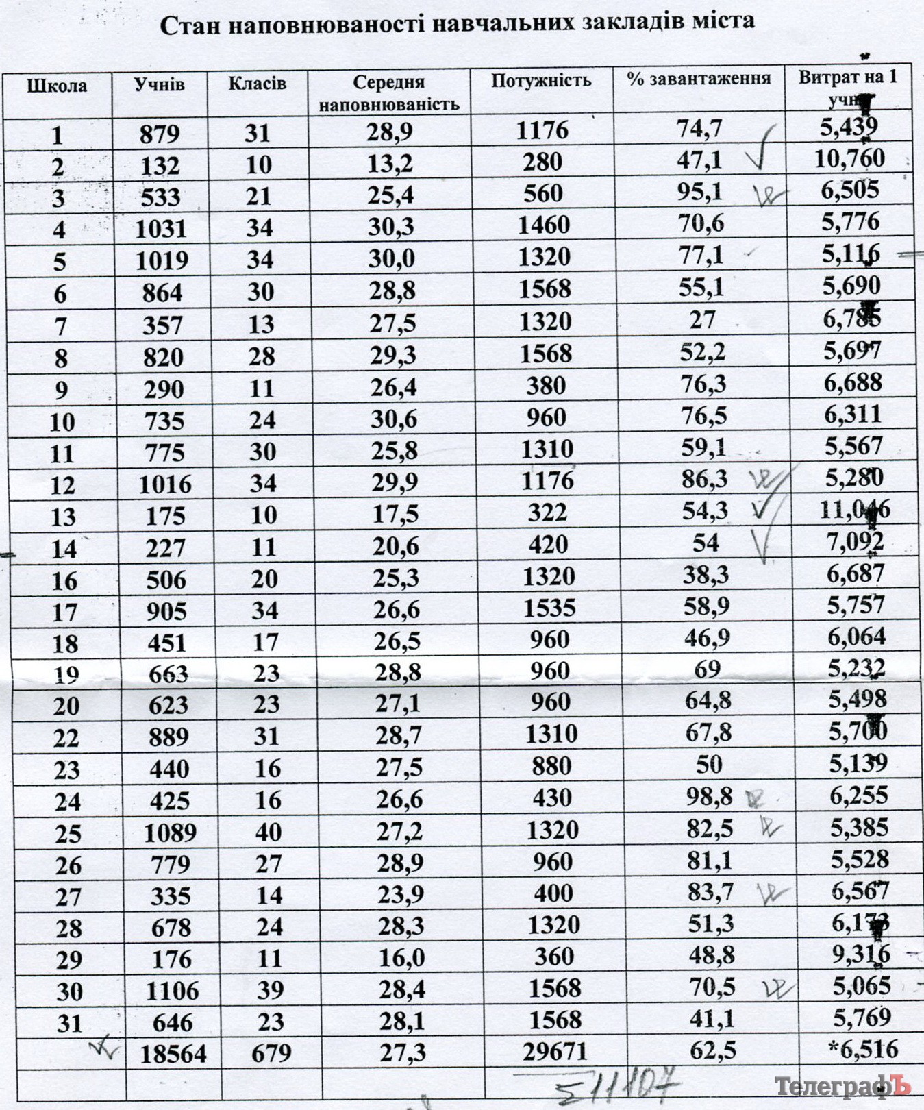 Вот таблица наполняемости школ, которой оперировала Татьяна Неиленко (первая колонка соответствует номерам школ).