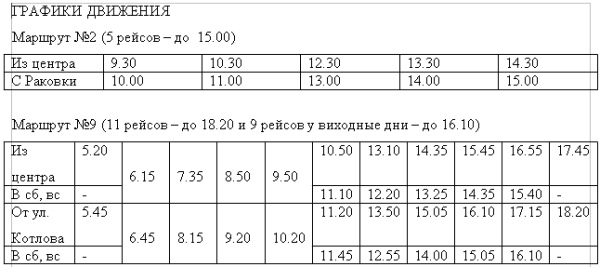 Но перевозчики сами определили, как возить льготников, разместив соответствующую информацию в автобусах. Так, на маршруте №2 (ЧП «Аделла») и на маршруте №9 (АТП-15307) осталось по одному автобусу в льготном режиме. В редакцию звонят кременчужане с жалобами на то, что льготных автобусов не дождешься. Публикуем графики движения – возможны изменения, так как исполком еще рассматривает предложения перевозчиков.