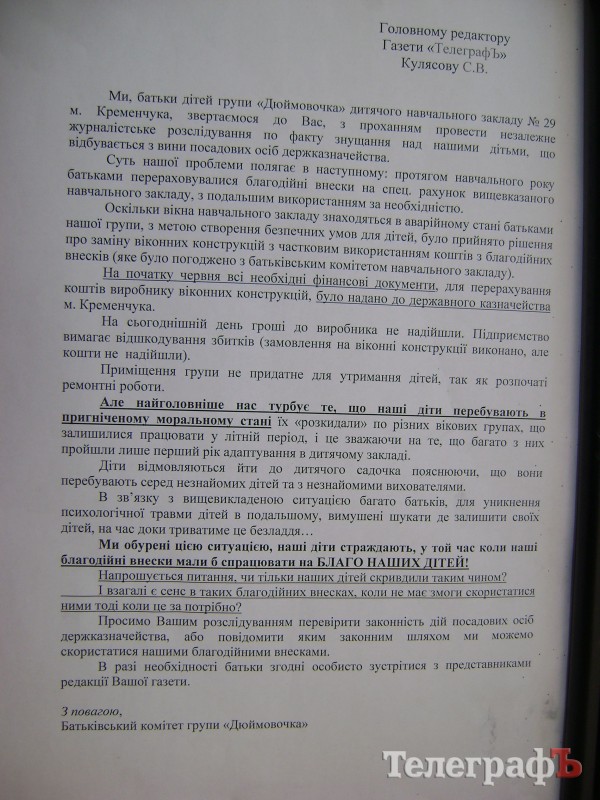 В редакцию обратились члены родительского комитета детсада № 29. Они сообщили, что в течение учебного года они перечисляли добровольные взносы на спецсчет садика, чтобы в последующем использовать их по необходимости.