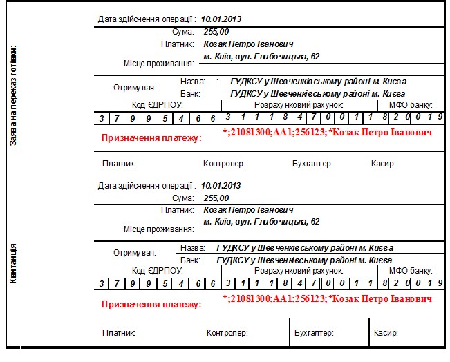 Пример заполнения в квитанции поля «Назначение платежа»