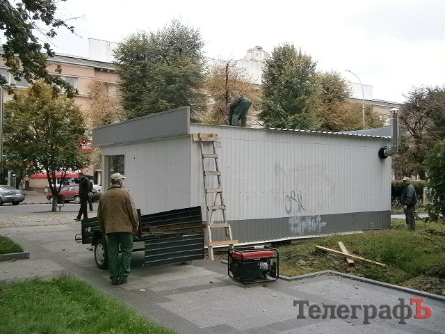 Представитель коммунального предприятия «Благоустройство Кременчуга» говорит, что сегодня его подчиненные приварят петли для погрузки киоска на грузовую платформу. Потом будет демонтировано оборудование внутри и сняты стекла, и только потом конструкцию вывезут.