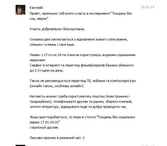 - Всю эту штуку я придумал, чтобы позвать на прогулку одну девушку, - рассказывает кременчужанин Евгений, который более недели назад разместил в соцсети объявление о том, что с 17 по 24 января предлагает всем желающим не пользоваться различными соцсетями типа «ВК», «Фейсбук», «Твиттер» и другими. - Я и не думал, что в этом будут участвовать больше двух человек. А потом решил, что, если будет немного массово, то девушке будет легче согласится на участие в таком эксперименте. Я стал рассылать предложение друзьям, некоторые отказывались, со словами, «мне и в ВК хорошо», другие говорили, что сейчас сложная ситуация в стране, нельзя оставаться без информации, а некоторые вообще стали сердится и «наезжать» за «спам». Но человек 5 согласилось.