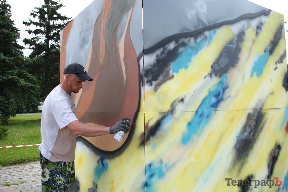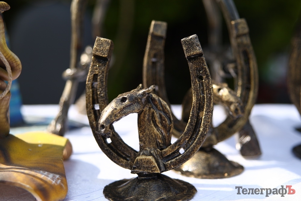 Возле входа в Приднепровский парк можно было увидеть изделия кузнечной мастерской Александра Крутька и наблюдать необычный способ украшения одежды – шоу аэрографии и росписи одежды от Анжелы Дмитренко.
