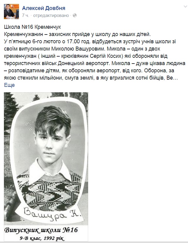Нагадаю, раніше було заплановано, що в Кременчуці у п’ятницю, 6 лютого, відбудеться зустріч учнів школи №16 з її випускником Миколою Вашурою.