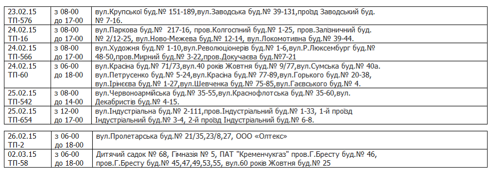 Где в Кременчуге не будет света с 23 февраля по 2 марта