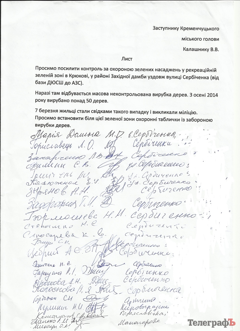 Как сообщила репортёр "Телеграфа" Татьяна Донченко, сегодня, в понедельник, после заседания исполкома Виктор Калашник заявил прессе, что собирается привлечь к проблеме несанкционированной вырубки деревьев в Крюкове вдоль ул. Сербиченко природоохранную прокуратуру.