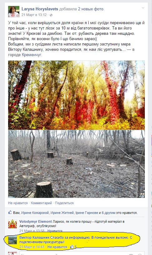 Об обращении к вице-мэру сообщила в соцсетях кременчугская журналистка Лариса Гориславец. В.Калашник отреагировал на её пост в Fb. Он написал ещё в субботу: "Спасибо за информацию. В понедельник выясню. С подключением прокуратуры!"