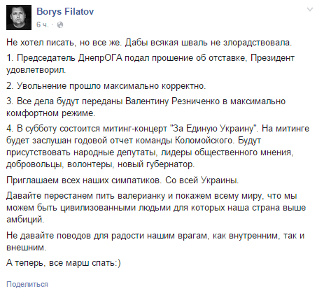Также Филатов, нардеп и бывший зам Коломойского, написал: