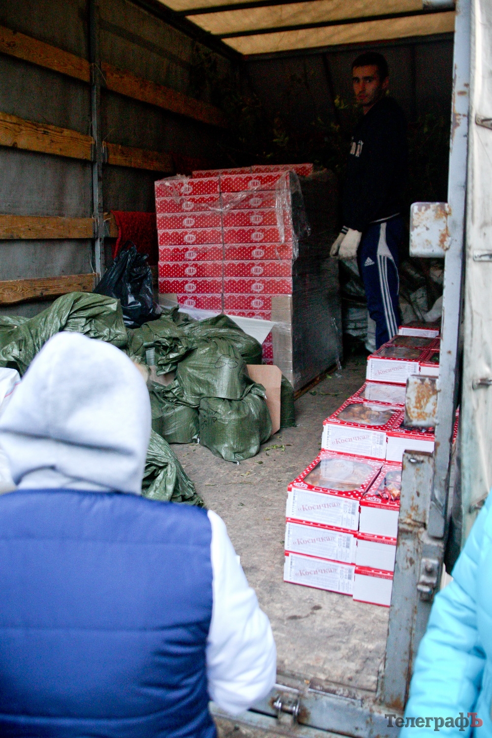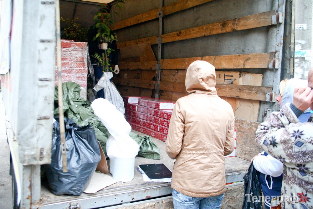 Возле машины сразу выстроилась живая очередь из граждан. Судя по всему, они знали о времени приезда автомобиля. Будку открыли. Оттуда гражданам начали выдавать коробки с печеньем, саженцы деревьев и непрозрачные полиэтиленовые пакеты (возможно, с инвентарем). Работали девушка и парень.