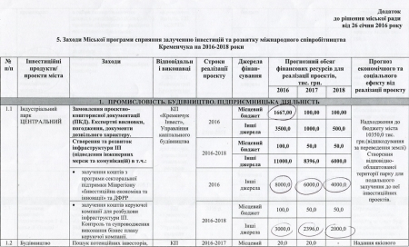 Строительство кременчугского индустриального парка также предполагает доступ к деньгам госбюджета. В новой городской Программе содействия привлечению инвестиций в разделе по технопарку «Центральный» так и записано: «залучення коштів з програми секторальної підтримки Мінрегіону «Інвестиційна економіка та інновації» та ДФРР».
