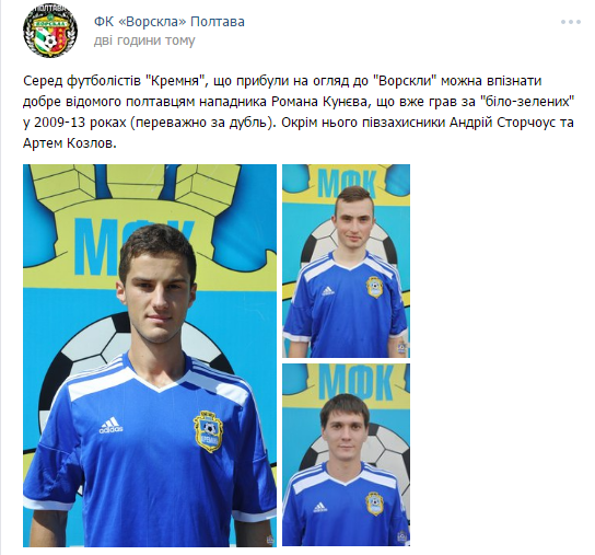 Як мінімум двоє гравців «Кременя» зараз у Полтаві на перегляді. Кращий бомбардир «Кременя» Артем Козлов та Роман Кунєв, який раніше грав у «Ворсклі». Також за інформацією прес-служби «Ворскли» клуб переглядає Андрія Сторчоуса, який захищав кольори «Кременя» на правах оренди.![]()