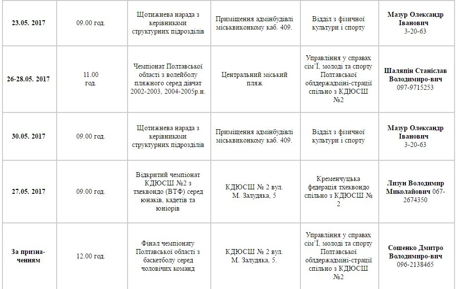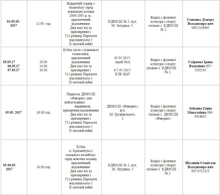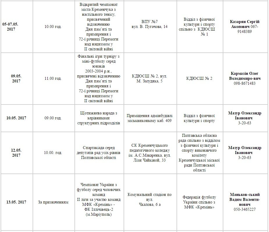 Спортивні заходи у Кременчуці на травень. Щоб збільшити таблицю - натисніть на неї:)