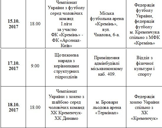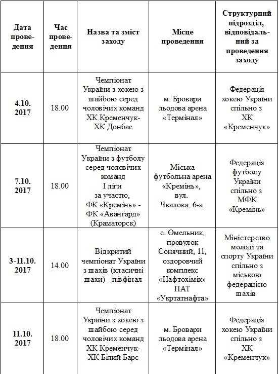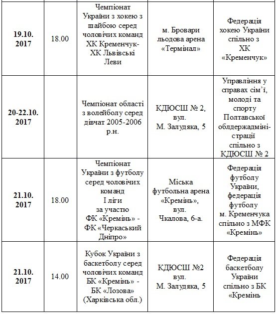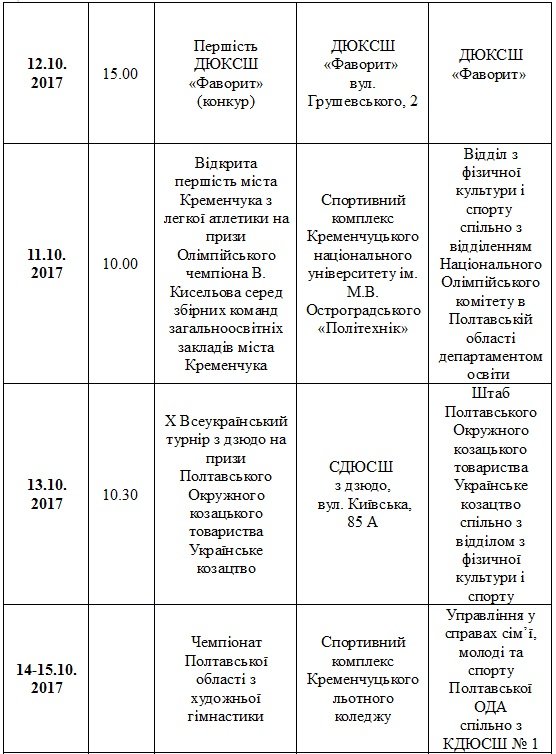 План спортивних заходів у Кременчуці. Жовтень