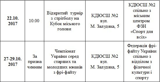 План спортивних заходів буде доповнюватися протягом місяця, слідкуйте за анонсами на нашому сайті. Щоб збільшити таблицю - натисніть на неї