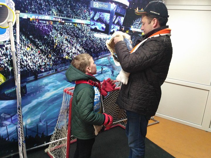 Тематична фотозона приваблювала до себе вболівальників, які тримаючи ключку фотографувалися на фоні воріт. Поміж великої кількості охочих все-таки вдалося знайти того на кого наліз шлем, ним був маленький вболівальник "Кременчука":)