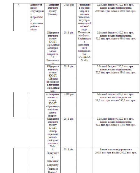 Вот первый вариант 2018-го года с изменениями. Отсюда уже исчез аптечный пункт на дальней Раковке. Зато появилось два очень недешевых аптечных пункта в очень бойких местах – в больнице «Кременчугской» и в больнице №1 им. Богаевского. Как видите, на аптечный пункт в «Кременчугской» собираются потратить 830 тысяч гривен, 780 из которых возьмут в городском бюджете. И лишь 50 тысяч – из собственных средств коммунальной аптеки №90. С аптечным пунктом в первой больнице аналогичная история – 630 тысяч всего, 580 из них – деньги бюджета. И лишь 50 тысяч – деньги аптеки.
