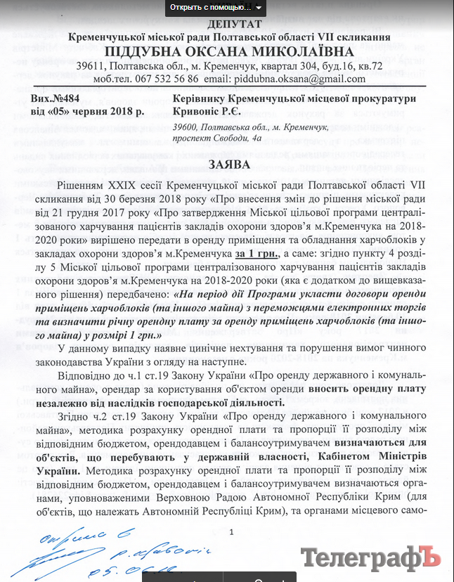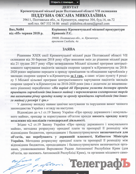 Сегодня, 5-го июня, депутат Кременчугского горсовета Оксана Пиддубная подала в прокуратуру Кременчуга заявление по поводу скандальной аренды кременчугских больничных пищеблоков за 1 гривну в год.