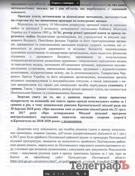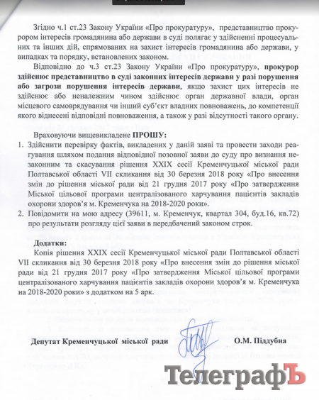 Она требует провести проверку законности решения Кременчугского горсовета, который передал неизвестной на тот момент частной фирме пищеблоки городских больниц вместе с оборудованием (движимое и недвижимое имущество) в аренду за 1 гривну в год. И, если в ходе проверки будет установлен незаконный характер данного решения, Пиддубная предлагает прокуратуре обратиться с иском в суд с целью признания решения горсовета незаконным и его отмене.