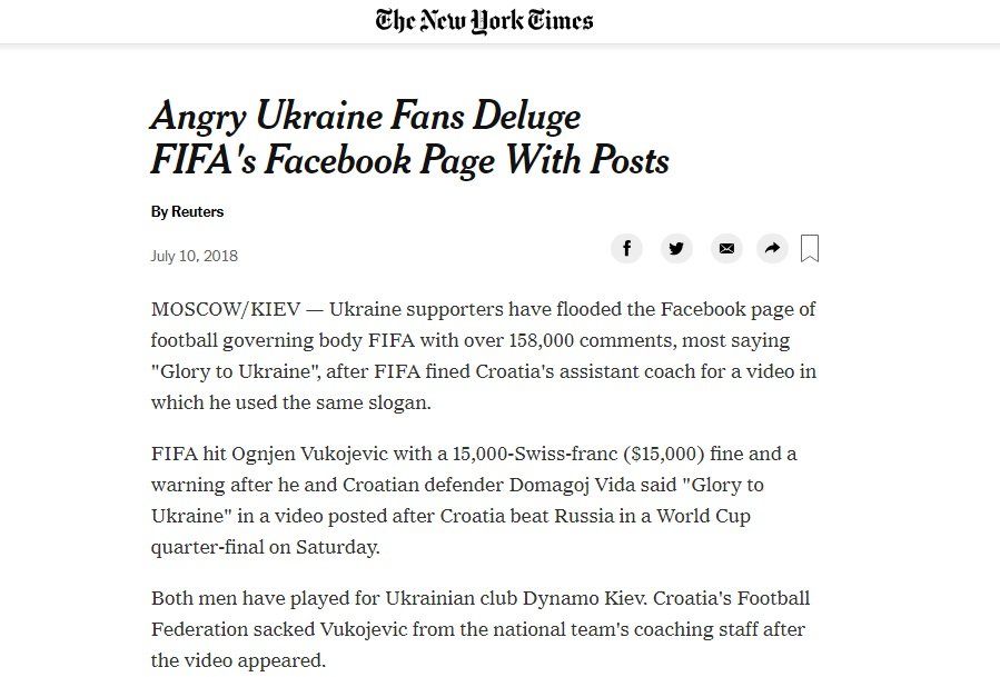 Багато відомих кременчужан залишали записи на сторінці в Facebook: від волонтерів до депутатів та міського голови. Один з таких написів навіть процитувала американська газета The New York Times. В статті «Angry Ukraine Fans Deluge FIFA’s Facebook Page With Posts» проводиться аналіз флешмобу, який призвів до обвалу рейтингу ФІФА на сторінці в Facebook. В матеріалі пояснюють, що відносини між Україною та Росією напружні у зв'язку з приєднанням Москвою у 2014 році Криму, а також підтримкою сепаратистів на сході України. Навіть деякі політики закликали країни бойкотувати Чемпіонат світу з футболу, який проводиться в Росії.