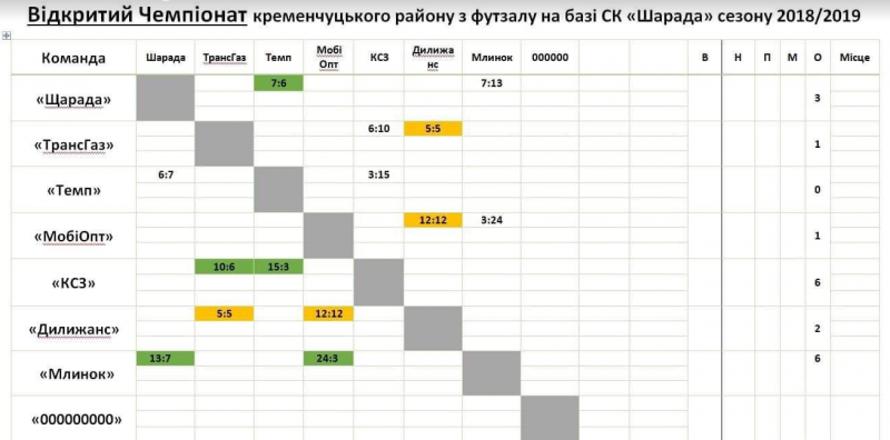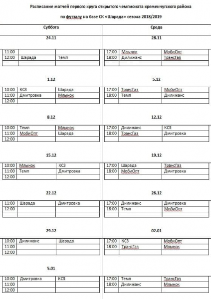 У Кременчуці в СК «Шарада» 24 листопада стартував Відкритий чемпіонат Кременчуцького району з футболу. 7 команд змагаються за звання кращої, проте протягом змагань може будь яка команда приєднатися до змагань. Загалом чемпіонат триватиме до 5 січня 2019 року.