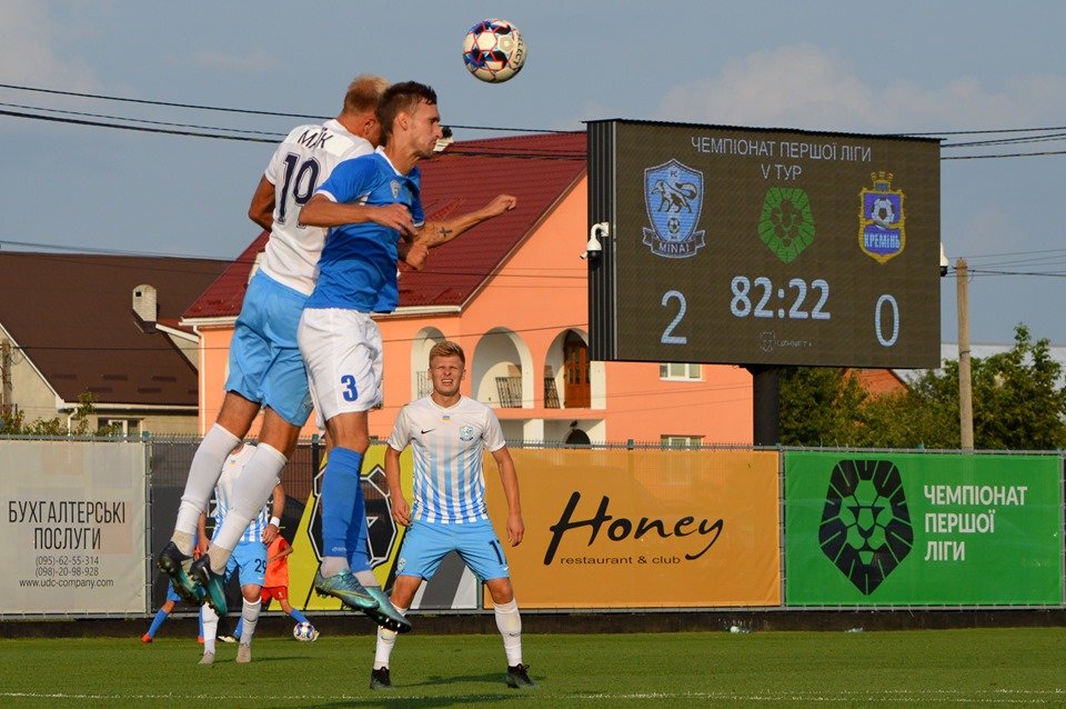 “Минай” розпочав гру більш активно. Господарі перевіряли кілька разів на міцність голкіпера “Кременя” Ореста Будюка. Карноза зі штрафного поцілив у нижній правий кут, а згодом Пиняшко закручував у дальню дев’ятку. У “Кременя” на 24 хвилині міг забити Воронченко, який обвів стінку, проте Попович парирував м’яч.