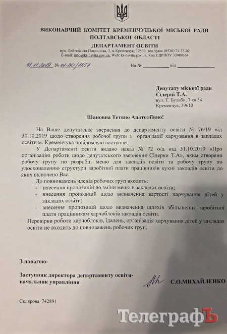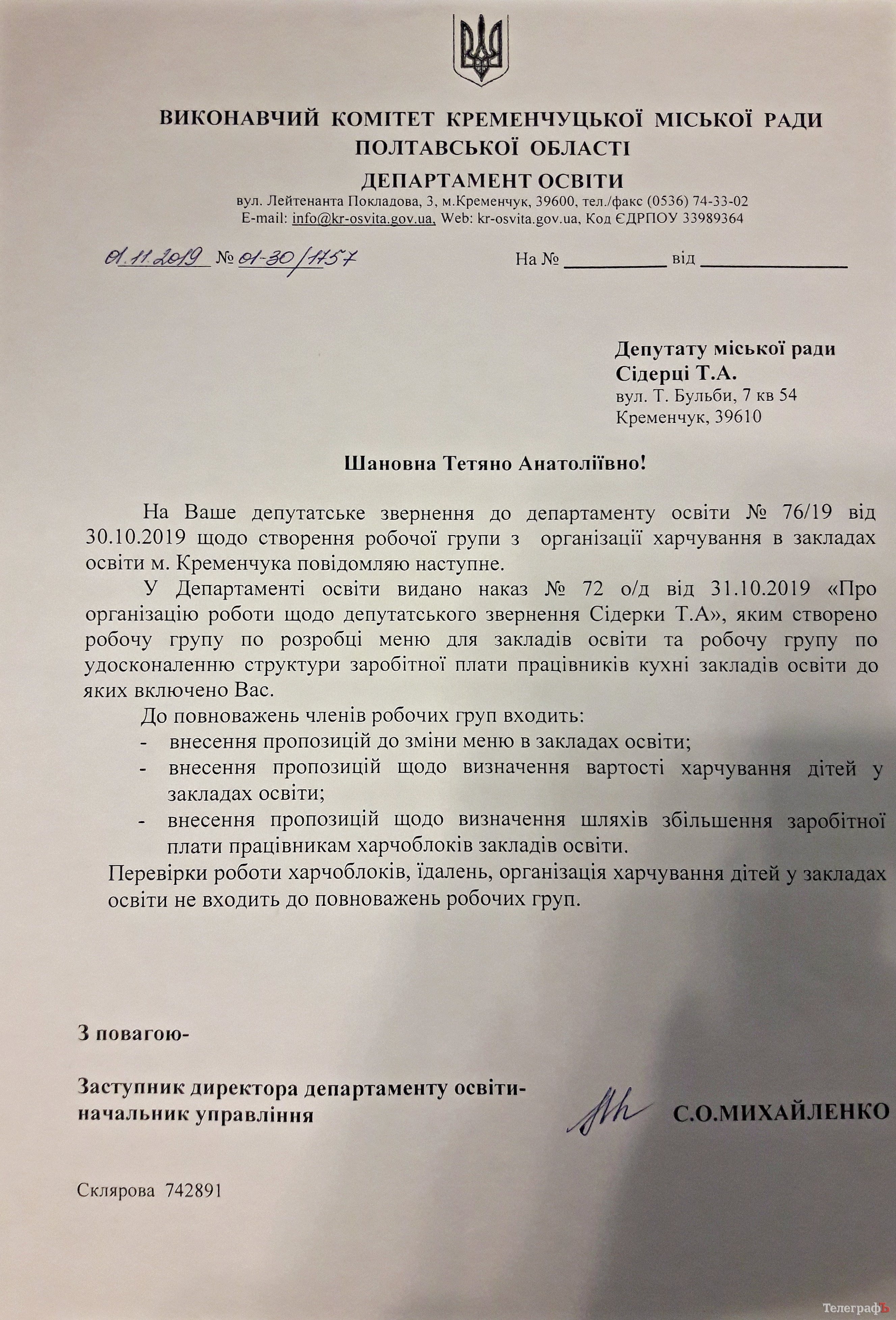 Також вона розповіла, що випадково дізналася про те, що пройшла єдина закрита нарада у кабінеті заступниці мера Ольги Усанової з приводу шкільного харчування, але про її проведення Тетяну Сідерку не сповістили. На цій нараді були присутні Геннадій Москалик, Ірина Друженко, Алла Склярова та головний технолог з департаменту освіти.