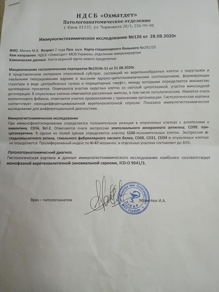 Дворічний Максим з Кременчука потребує допомоги в лікуванні саркоми. Хлопчика прооперували 14 серпня в «Охматдиті». Кілька днів тому, після довгої діагностики, йому поставили діагноз - синовіальна саркома.