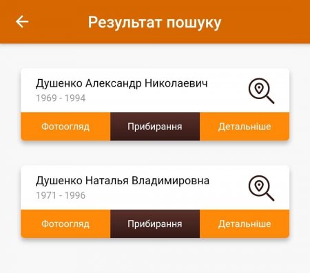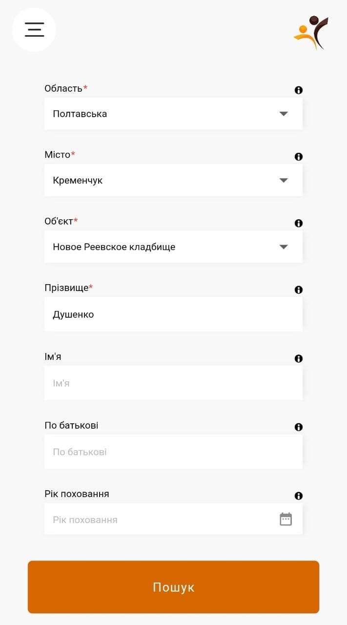 Далі оберіть область, місто та цвинтар. Введіть кілька літер прізвища вашої близької людини та натисніть пошук.