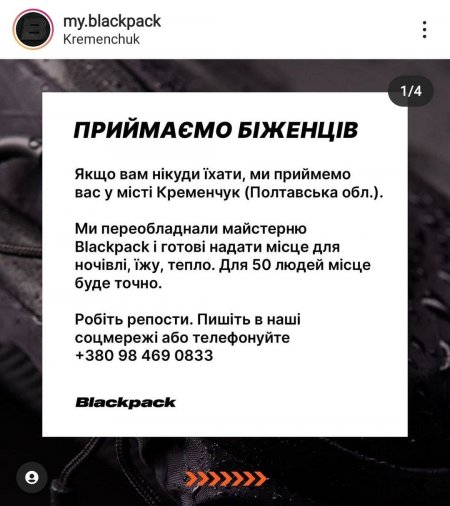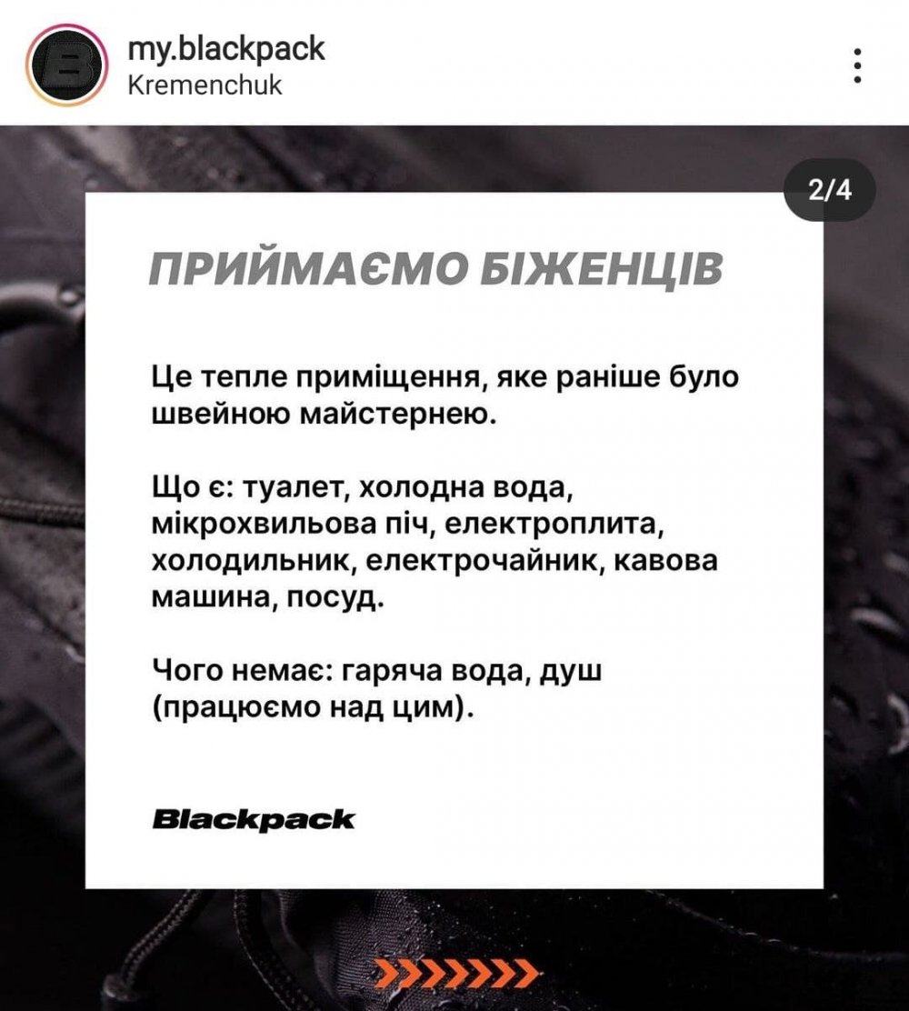 Кременчуцькі стартапери, які колись взялися за створення ідеального наплічника-трансформера, переобладнали майстерню бренду Blackpack, щоб приймати біженців. Про це вони повідомили у своєму інстаграмі.