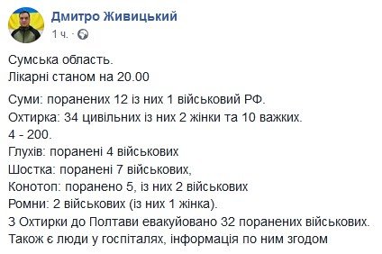Згідно з повідомленням чиновника, станом на 20.00 у лікарнях Сум 12 поранених, з них один – військовий Росії.