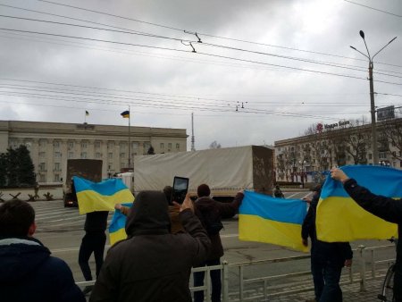 А у Херсоні люди вийшли протестувати з українськими прапорами проти фейкової гуманітарної допомоги путіна.