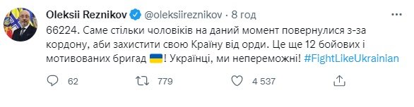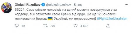 - 66 224. Саме стільки чоловіків на даний момент повернулися з-за кордону, аби захистити свою Країну від орди. Це ще 12 бойових і мотивованих бригад. Українці, ми непереможці! - заявив Олексій Резніков.