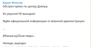 Окупанти сьогодні, близько 20.00 обстріляли місто Дніпро. Інформацію оприлюднив міський голова Борис Філатов. Він закликав залишатись в укриттях та чекати на офіційну інформацію військової адміністрації.