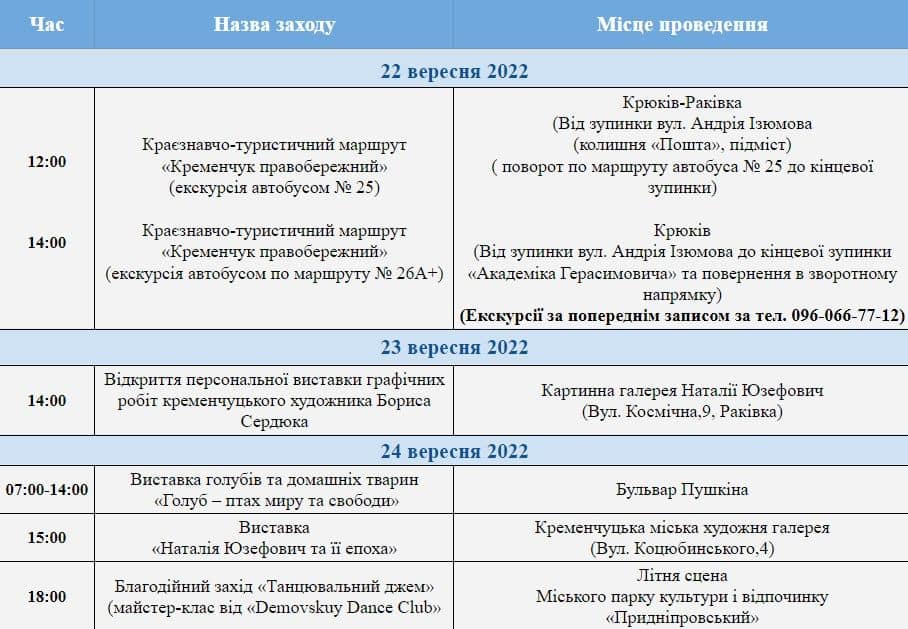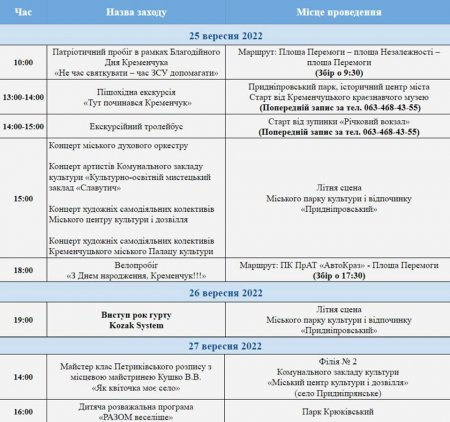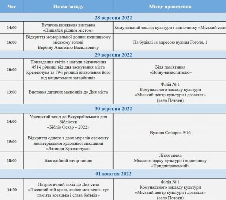 Став відомий план заходів (дивіться у фотоблоці нижче) до Дня міста Кременчука, його опублікувала пресслужба мерії. Як бачимо, перші заходи пройдуть вже завтра, 22 вересня, а завершиться програма 1 жовтня.