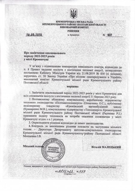 Рішення про припинення опалювального сезону у Кременчуці міська рада ухвалила 28 березня.