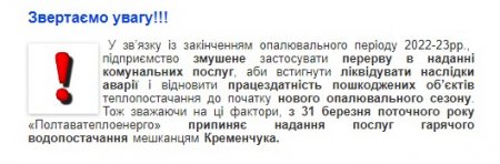 На сайті ПОКВПТГ «Полтаватеплоенерго» офіційно повідомили про припинення гарячого водопостачання у Кременчуці 31 березня.