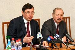 Міністр внутрішніх справ Юрій Луценко (зліва) на колегії облдержадміністрації в Полтаві пояснив головному санітарному лікарю Кременчука Віктору Акімову, що в законопроекті про національну гвардію на неї покладається зокрема екологічна функція. На прес-конференції головного міліціонера, який говорив переважно про вибори, супроводжував соратник по Соцпартії губернатор Степан Бульба (справа)