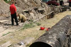 Робітники, аби усунути неполадки, розбили асфальт і за допомогою ескалатора вичерпували з ями воду, бруд та уламки асфальту. Занепокоєні працівники «Укртелекому» підтягнулись на місце аварії, аби врятувати свої телефонні кабелі. «Чи серйозна поломка? – запитую в одного з тих, хто «рятує» колектор. «От воду відчерпають і побачимо, який там порив. У червні ось тут його ремонтували, – чоловік показує на ділянку метрів за десять від «розкопок», – а тепер тут прорвало!».