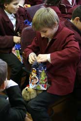 «А можна мені телефон – он він, он?!!» – просив хлопець, а ми не могли зрозуміти, де той телефон. Він сам його витягнув з мішку подарунків. Ми так і не здогадалися, як малий побачив через непрозорий, вщент забитий іграшками, мішок малесенький іграшковий мобільний телефон.