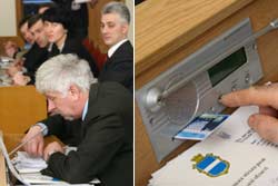 Сесія міської ради, що відбулась 27 лютого, проходила за новими правилами – депутати голосували не «вручну», а за допомогою кнопок. Електронну систему голосування «Рада-В», яку збирались встановити у сесійній залі ще місяць тому, нарешті змонтували. Відтепер у залі красуються два продовгуваті екрани, що висвічують результати голосування. У кожного депутата на робочому місці вмонтовано пульт з трьома кнопками, екраном та мікрофоном. Ну прямо-таки Верховна Рада. Навіть «пікає» під час голосування так само довго та противно. Головна кнопка, звичайно ж, дісталась міському голові. Саме він може дати команду «голос» – увімкнути мікрофон депутату, або навпаки – вимкнути «перший мікрофон». Ще мер може посилати повідомлення на екрани народних обранців, а на його особистому моніторі відображається вся «депутатська розкладка».