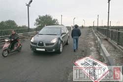 Рушаємо перевірити, чи припинився потік авто через міст. Адже мер наказав. І як суворо наказав! Наш фотокор вважає, що слід десь зачаїтися у кущах, бо авто перетинатимуть міст нишком. Та де там! За кілька хвилин з‘ясовуємо, що ніхто від камер не ховається. Їдуть упевнено, а охоронець мосту від фірми „Талєкріс” (ця організація ремонтує міст) тільки й встигає відкривати металевий шлагбаум. Міліціонера не бачимо.
